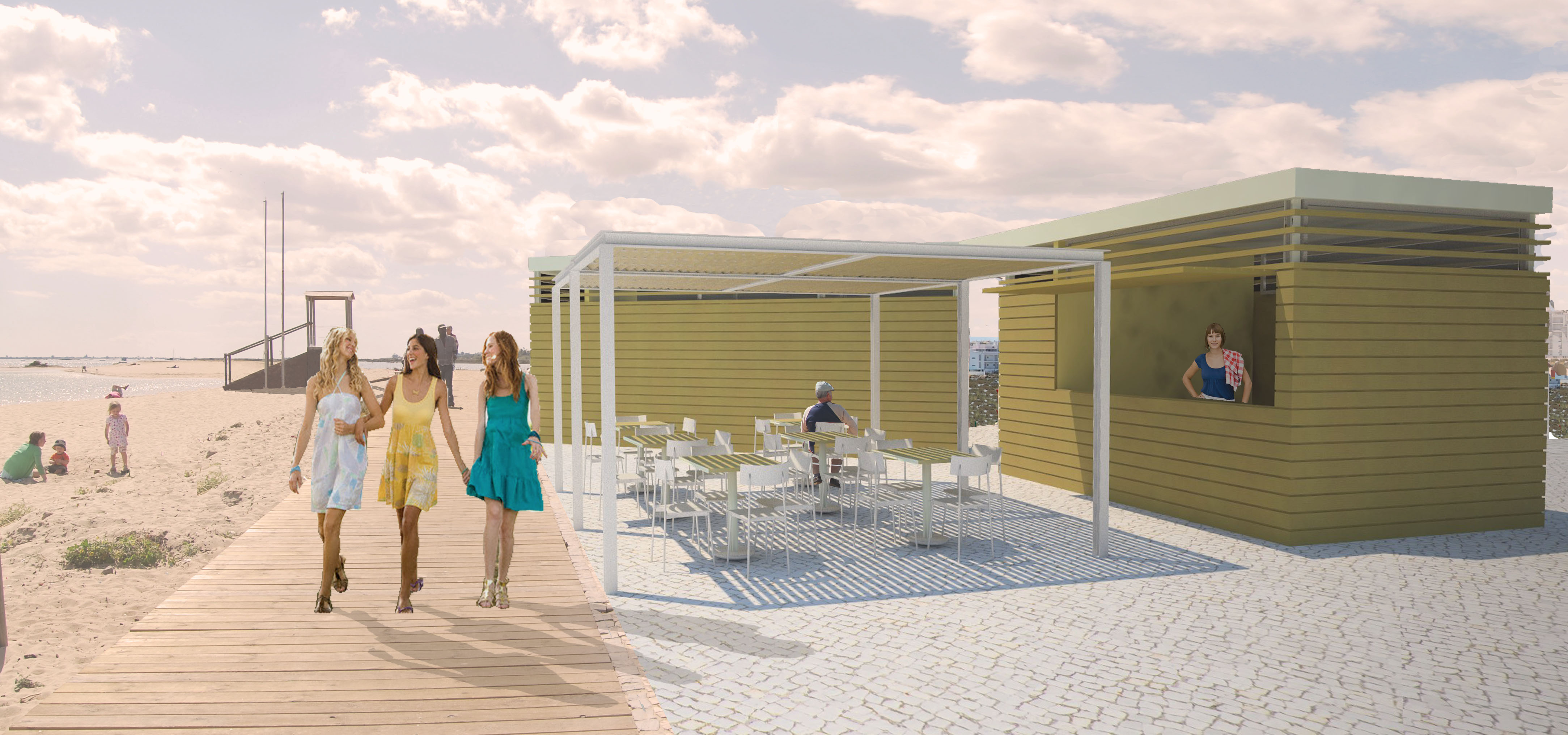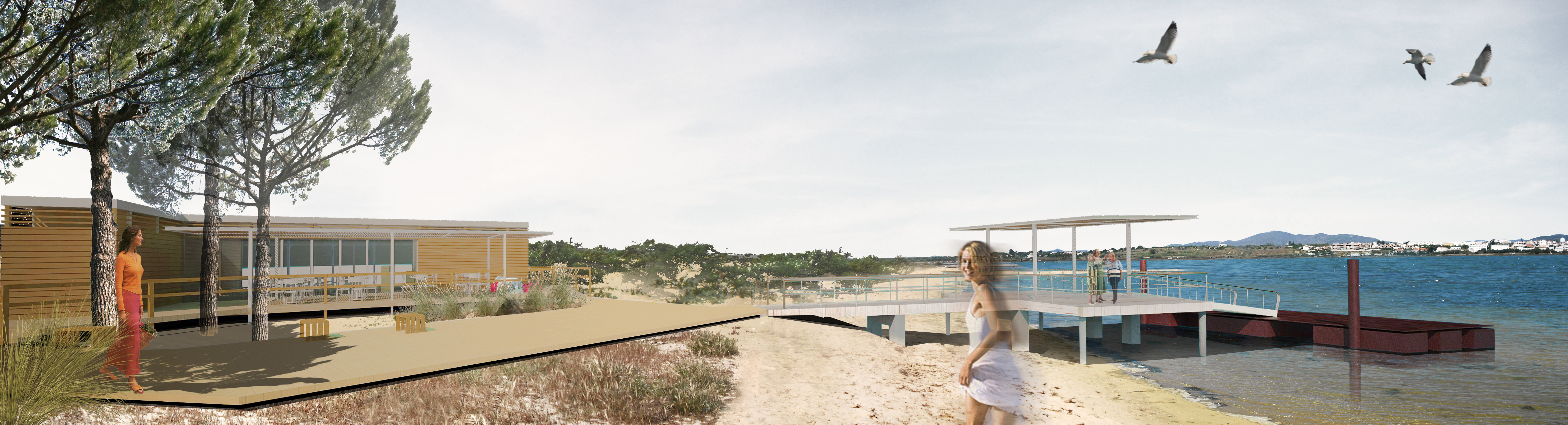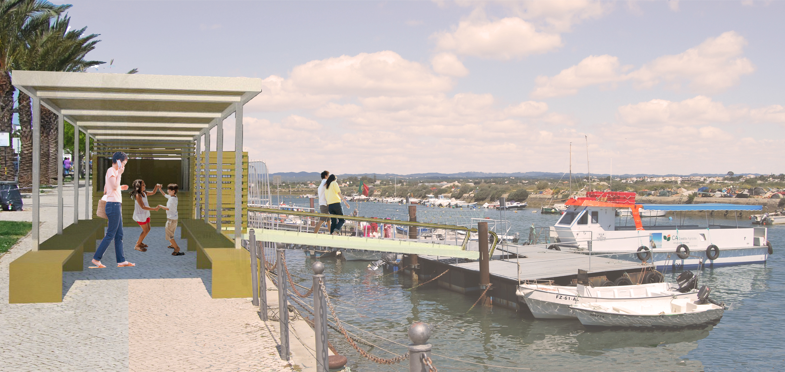 The Dock Square is the central point of the intervention at Fuseta-Mar. In addition to a mandatory crossing point from the dock to the beach, it is intended that this is a stopping and rest area so that the stay will be promoted in the shade of trees that leave openings in the walkway with the implantation of some furniture for the effect, useful for those who wait for the boat or for those who just want to rest.