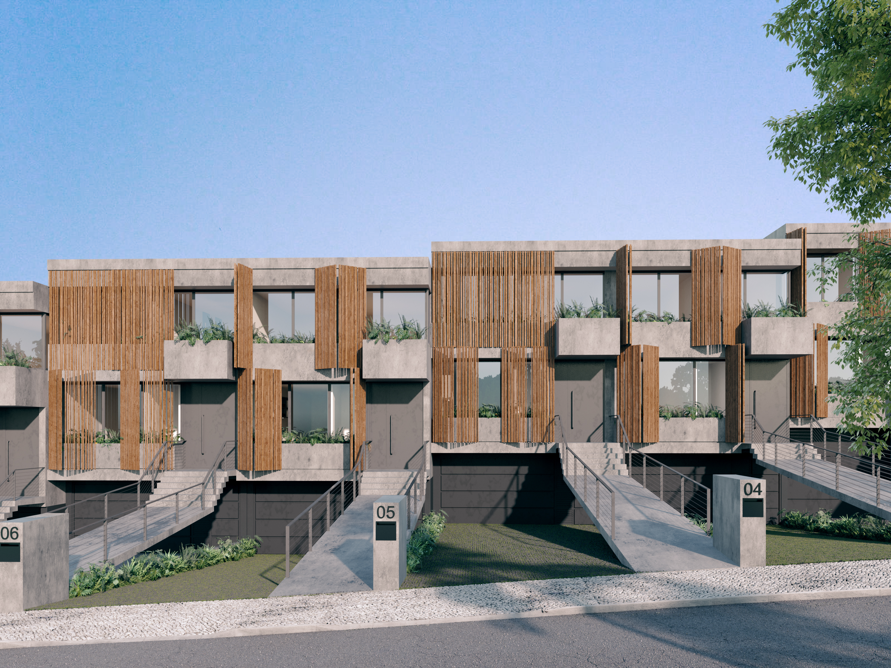 A proposta assenta, assim, na edificação de 13 moradias em banda de tipologias T3 e T4, agrupadas duas a duas, com um último conjunto de três. Existe, entre cada conjunto, um desfasamento tanto altimétrico como planimétrico que acompanha a topografia existente e a inclinação da rua projetada. Os lotes de 1 a 10 correspondem a moradias duplex e os lotes de 11 a 13 a moradias triplex.